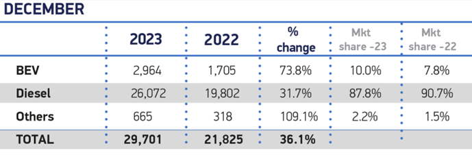 Final 2023 figures from Morris’ home UK industry body, the SMMT, show a continuing strong shift to electric vans with December registrations up 73% on December 2022 and annual registrations up 21%, despite the mid-year relaxation of the 100% BEV target moving from 2030 to 2035.
