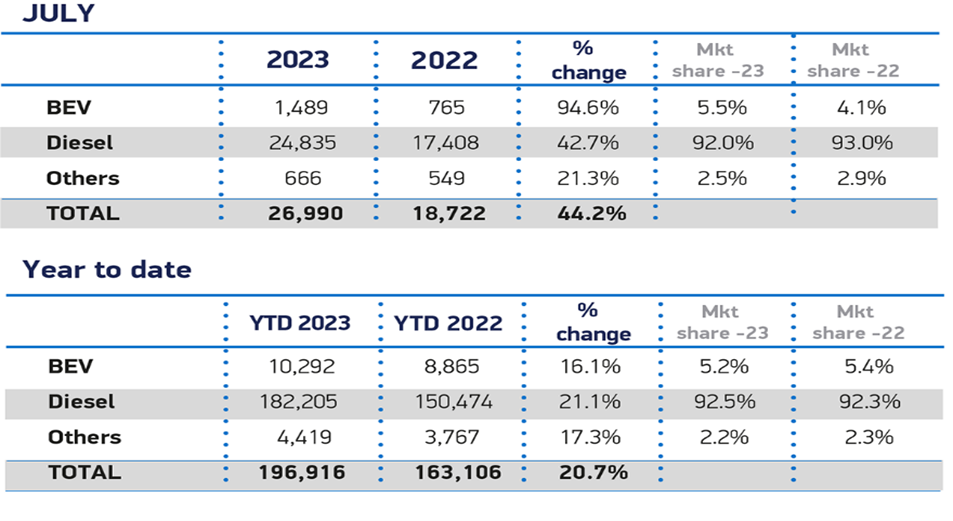 Last month saw some very encouraging news from the SMMT concerning Commercial Vehicle sales in the year to August 2023 with growth of 20.7 % YTD, and the significant growth of Electric Vehicles (BEV) content of 94.6 % in August. Excellent market signals and positive news for Morris.
